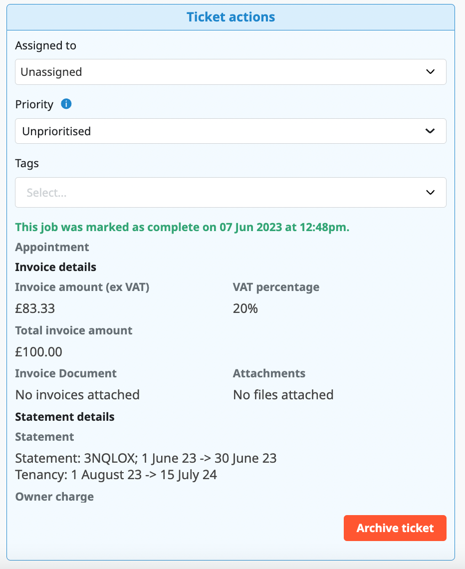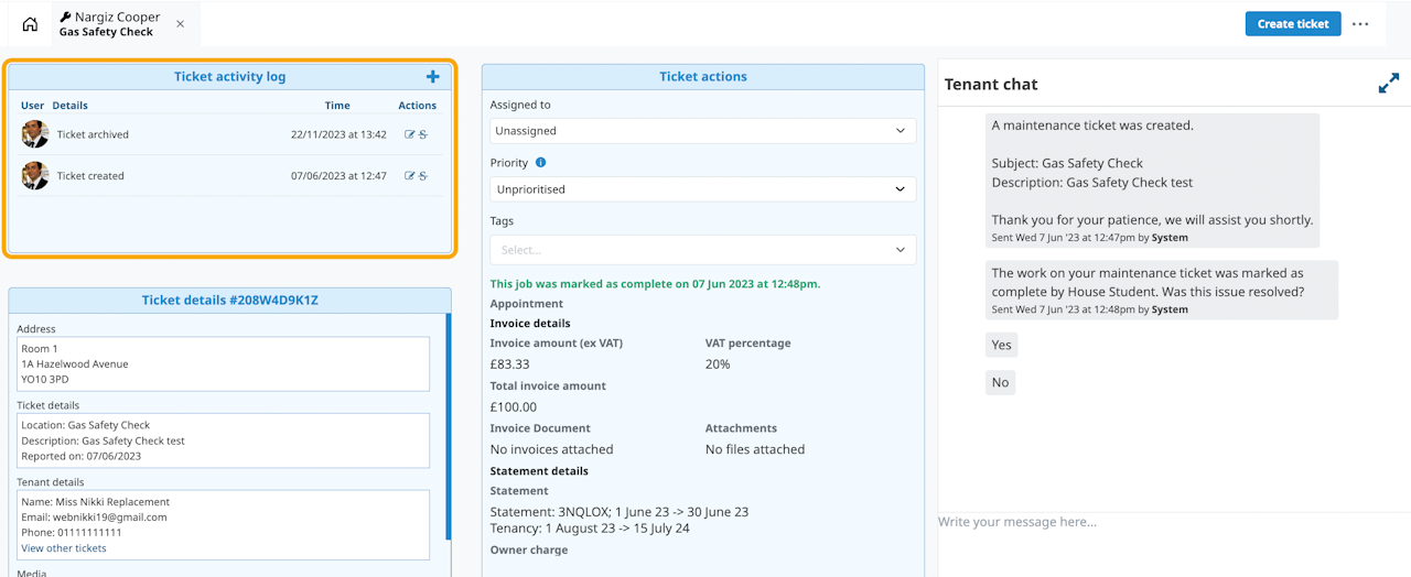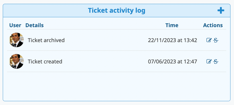 When the ticket is archived, the note about this action appears in the ticket activity log.