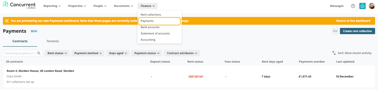 Navigate to the Payments dashboard from the Finance menu on the top.