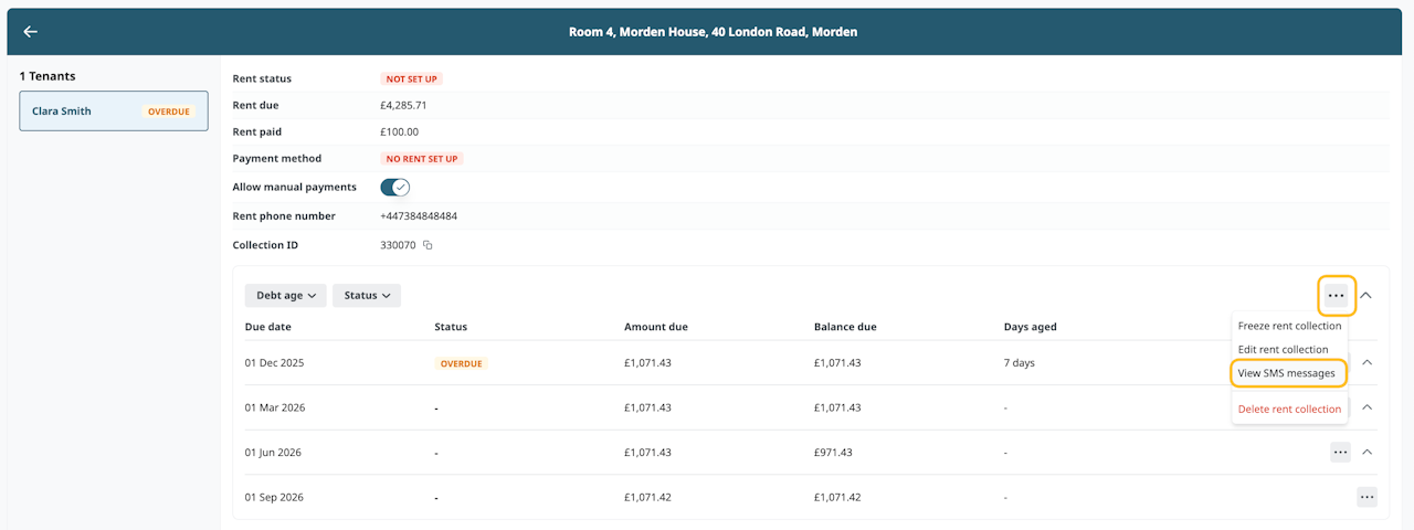 From the actions menu (...) of the rent collection, select an option to View SMS messages.