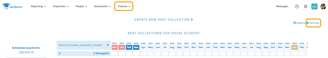 Navigate to your Rent dashboard (under the Finance menu) and click Settings in the top right.
