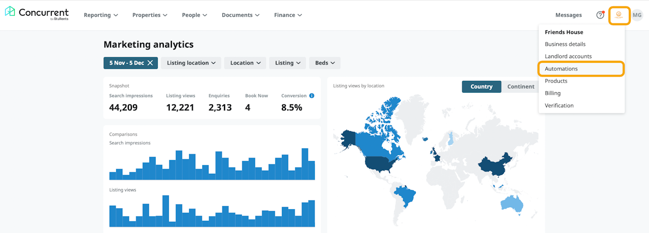 After you log in, navigate to Automations in the Landlord menu - your logo icon in the top-right corner.