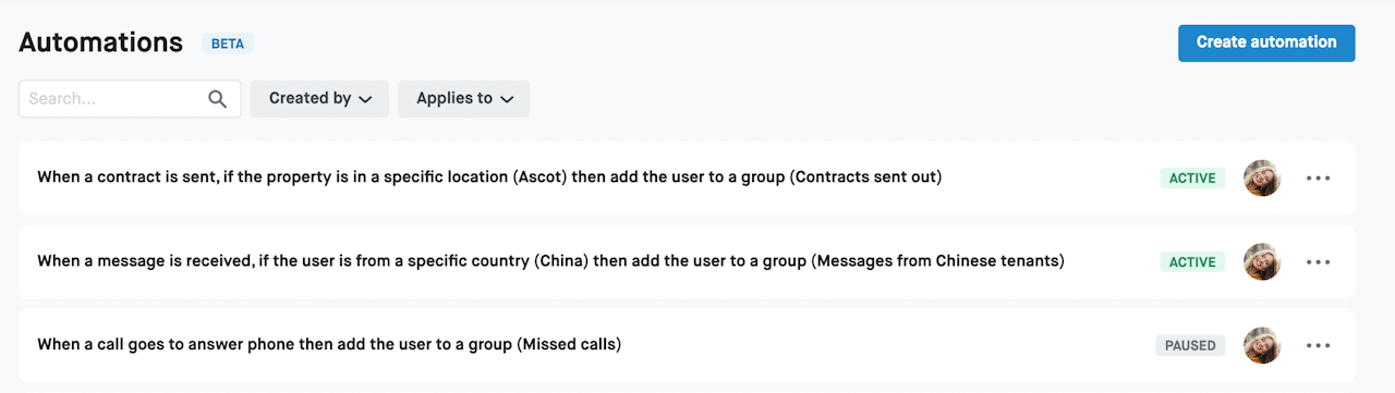 Here you can see the Automations dashboard where there is the list of all your active and paused automations. You can filter them by the user who created the automation and what account the automation is applied to.