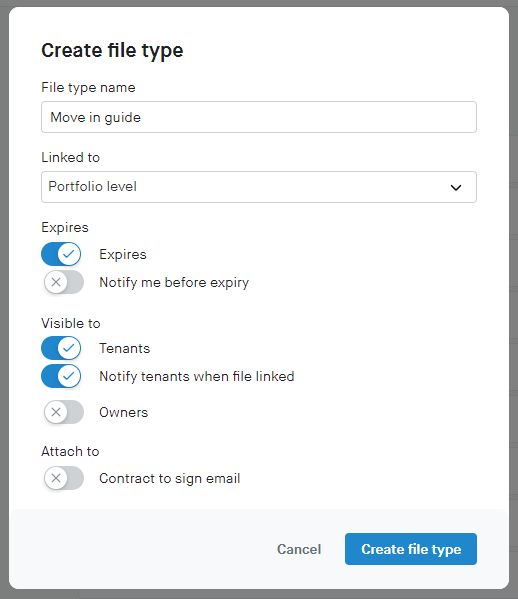 Enter a file type name, select where the file is linked, the expiry date, what users the file will be visible to, and if you want to attach the file to the contract to sign email.