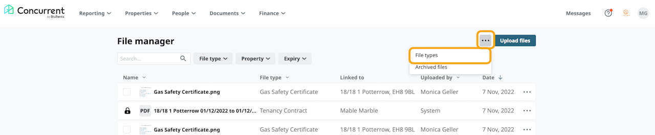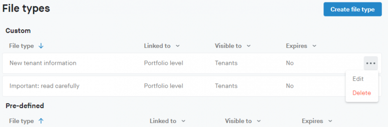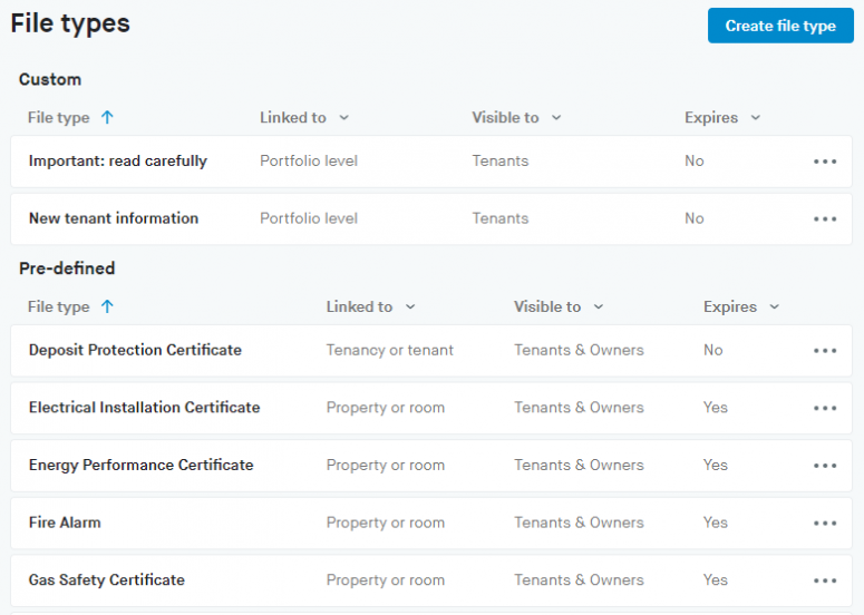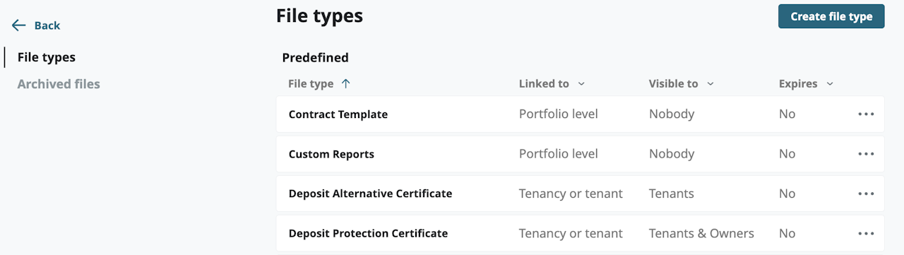Pre-defined file types can be used by a user on your account when they upload file. There are also files generated automatically by the system such as a signed tenancy agreement or a statement of account.