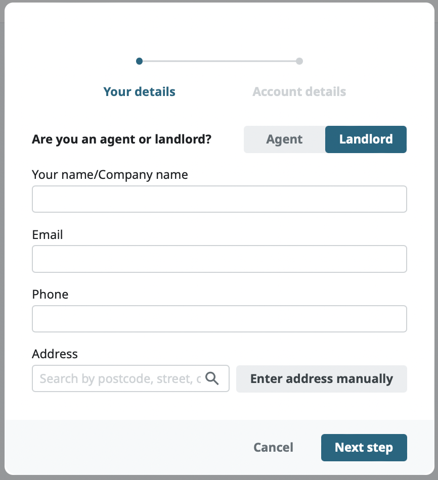 Select if you're an Agent or Landlord.