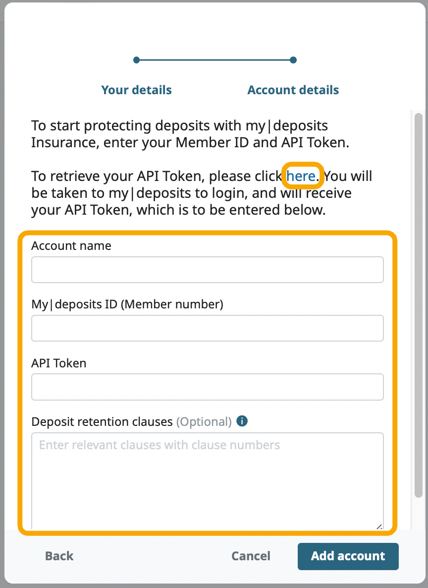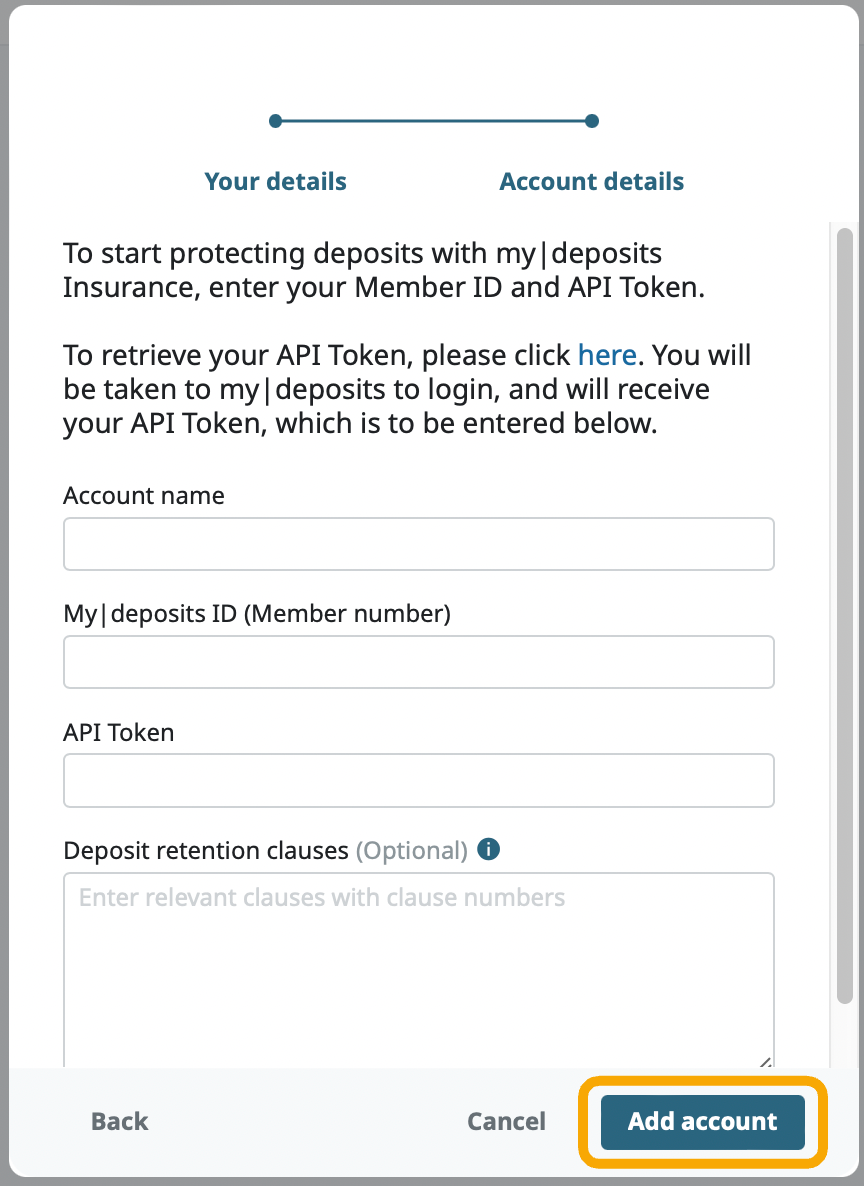 Enter your Account name, mydeposits ID (Member number), API token.