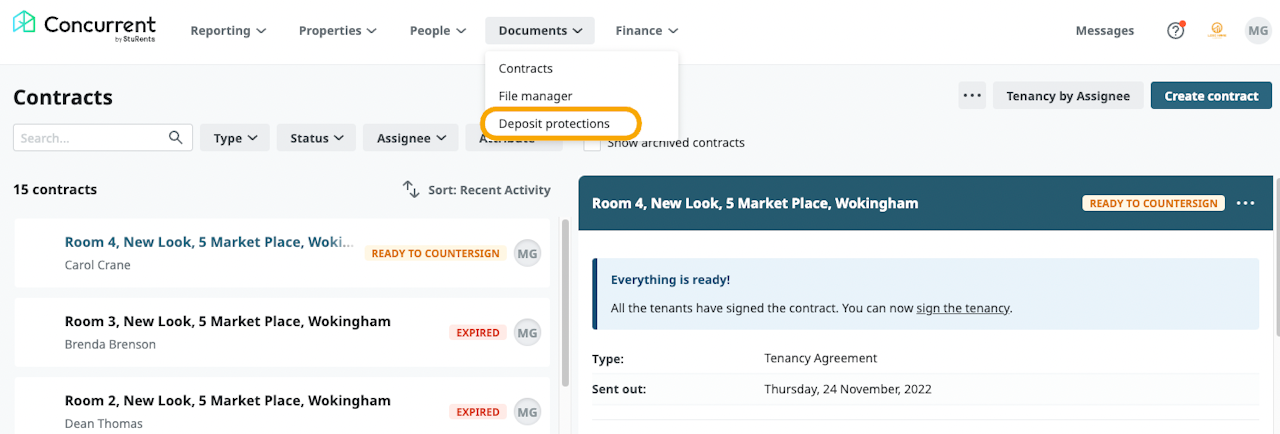 Navigate to the Deposit protections dashboard under the Documents tab.