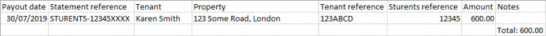 Payout amount – the total amount that was paid out. The payout amount and rent amount can differ if collected deposits are included.