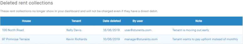 Deleted rent collections are not shown on your Rents dashboard and will not be charged even if they have a direct debit set up.