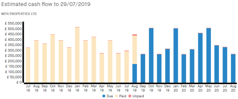 The chart displays the payments that are due, payments that are scheduled, and if they are paid or unpaid.