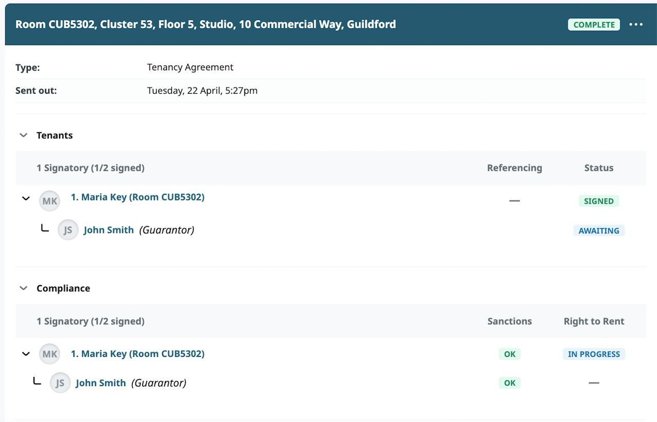 These checks are carried out automatically at the point the tenant/guarantor signs the contract, using their first name, surname, nationality and date of birth.