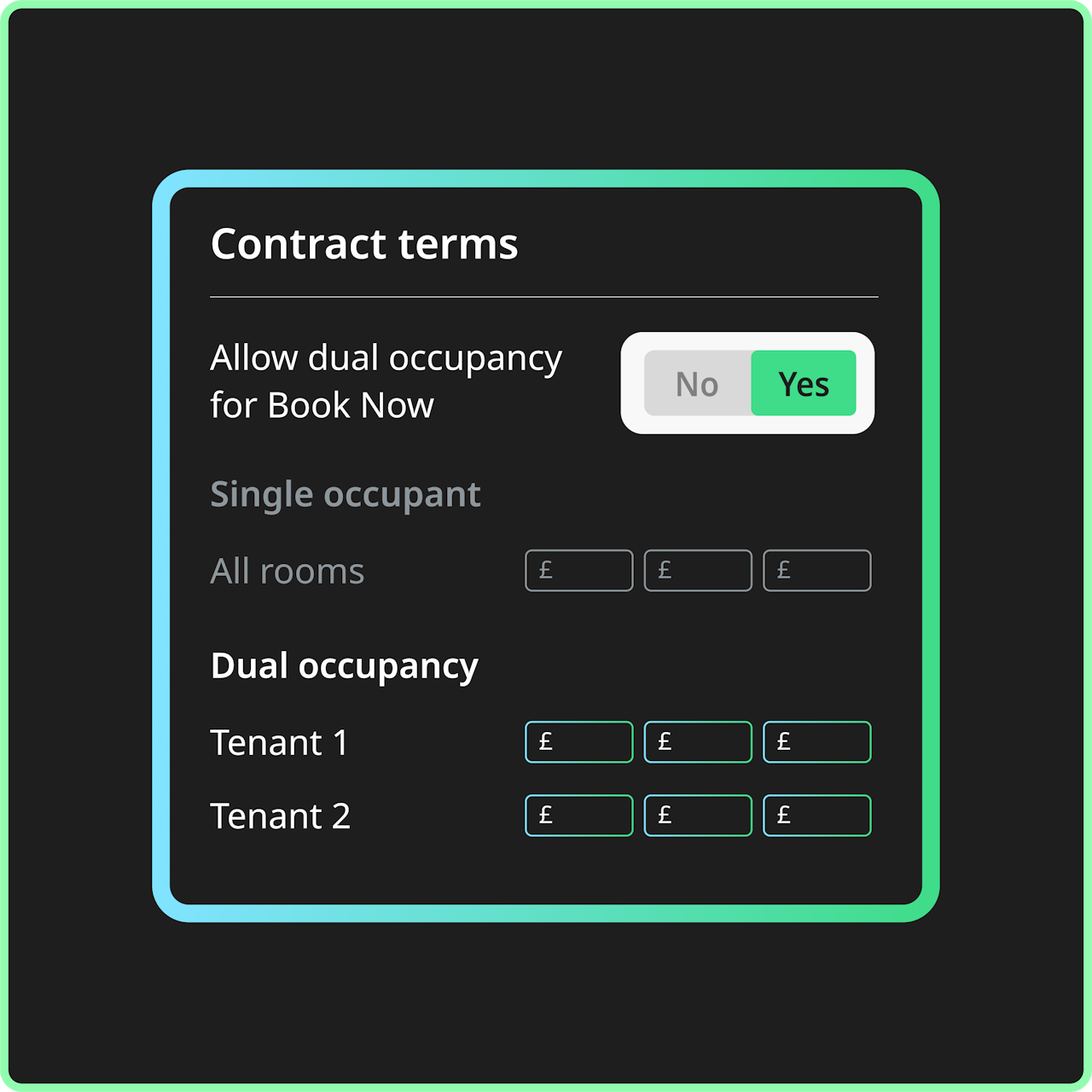 You can now configure your PBSA availabilities to enable tenants to make dual-occupancy bookings through the "Book Now" feature. You have the option to determine whether dual occupancy is allowed for each availability and can specify the deposit and rent amount payable by each occupant.