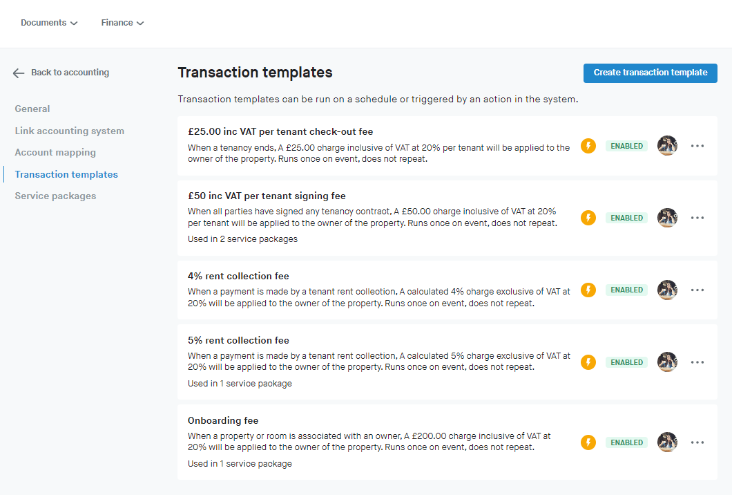 Transaction templates are managed from the Transaction templates page. This is accessed by clicking the [...] menu icon in the top right corner on the Statement of Accounts dashboard, then clicking Service packages. From there, click Transaction templates.
