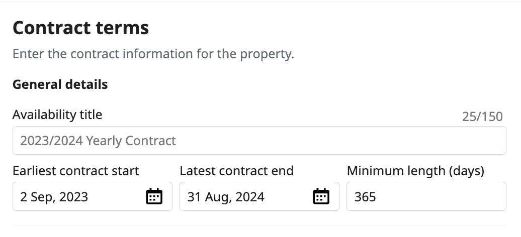 Review and update the Contact terms section to ensure the title, start date, end date and minimum term are correct for your new lettings period.